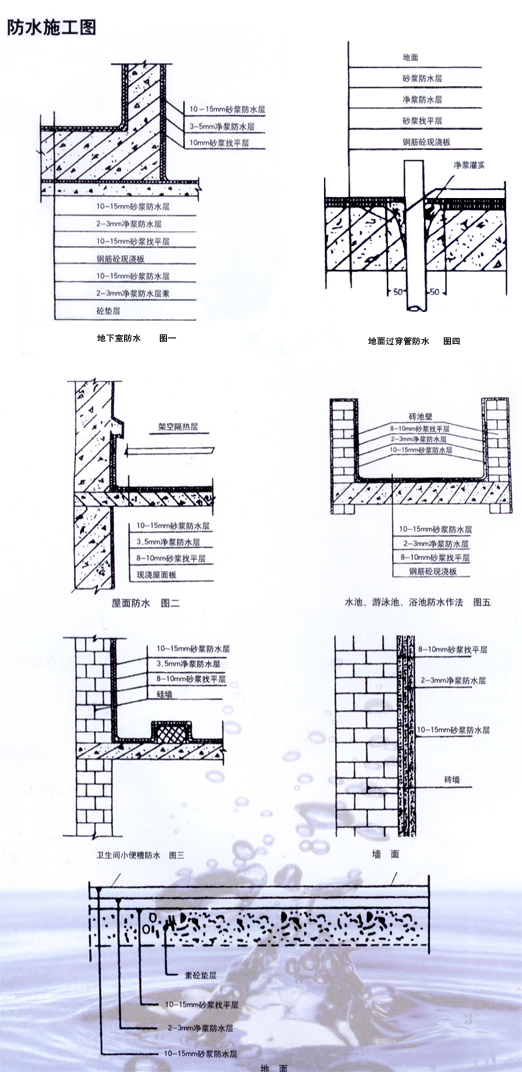 施工工艺是防水工程的关键环节,因此必须严格把关,精心操作。一般施工程序要有:基层处理---抹防水净浆层---抹防水砂浆层---养护。