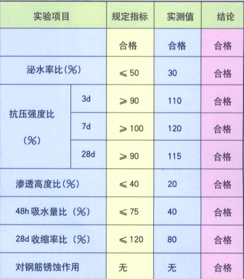 高效砼防水剂主要技术指标 (依据JC474-1999标准,所检项目均符合标准要求)